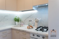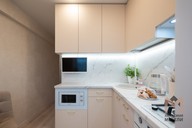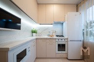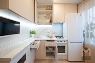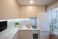 Корпус выполнен в декоре «Белый снег», а фасады — из МДФ «Софт Латте» с матовой, тактильно приятной поверхностью. Нежный бежевый оттенок поддерживает естественный свет из окна и визуально объединяет технику и стены в единую композицию. Ровные глухие фасады подчеркивают аккуратную геометрию кухни.