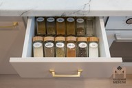 Кухня под потолок: верхний ряд цельный, без антресолей и разрывов, что даёт больше мест для хранения и визуально «расширяет» помещение. В нижнем ярусе — выдвижные ящики и полки. Техника встроена - СВЧ, духовой шкаф, варочная панель и вытяжка. Отдельно стоит только холодильник, но и он поддерживает светлую палитру.