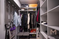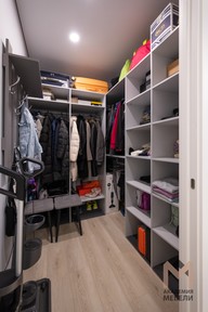 В гардеробной использован корпус из Lamarti «Серый» — материал устойчив к ежедневной нагрузке и хорошо держит геометрию высоких секций. Вдоль стен — системы хранения от пола до потолка: штанги для верхней одежды, открытые полки для обуви и коробок, а также дополнительные ячейки под чемоданы и сезонные вещи. Открытая конструкция позволяет сразу видеть всё содержимое и быстро находить нужное.
