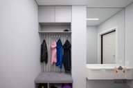 В прихожей собраны все нужные функции: зона для верхней одежды, место для сидения и хранения обуви, зеркало и консоль. Основу составляет компактная система с мягкой скамьёй, вертикальными панелями с крючками и верхним модулем для сезонных вещей. Корпус выполнен из Egger «Рейн» и «Белый премиум», что даёт нейтральный серо‑белый фон и хорошо сочетается с серым интерьером.