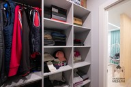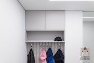 Отдельный модуль с крючками у входа в гардеробную дублирует приём из прихожей и создаёт удобное место для временного размещения одежды. Даже при полной загрузке гардеробная остаётся организованной: за счёт точных размеров секций и ровного монтажа нет «висящих» пустот и случайных стыков.