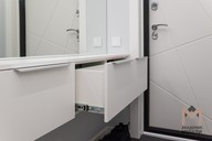 Антресоль открывается от нажатия, фасады остаются гладкими, а мебель не «давит» в узком коридоре. На выдвижных ящиках и подвесной тумбе у зеркала установлены накладные и торцевые ручки: они почти не заметны визуально, но удобны в ежедневном использовании. Большое зеркало на стене добавляет глубины и позволяет оценить образ перед выходом.