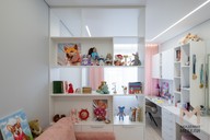 Нижний ряд перегородки состоит из вместительных модулей с закрытыми фасадами, куда удобно убрать игрушки, канцтовары и другие необходимые вещи. Такая конструкция не перегружает пространство, поддерживает ощущение легкости и красиво зонирует комнату.