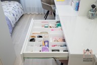 Главным элементом системы хранения стал вместительный шкаф, полностью занимающий нишу от пола до потолка. Благодаря антресольному ряду и высокой конструкции хозяйка комнаты получила максимум пространства для одежды, сезонных вещей и текстиля. Внутри удачно сочетаются штанги для верхней одежды, просторные полки для трикотажа и ящики для мелочей.