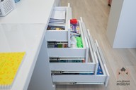 Длинные накладные ручки визуально вытягивают фасады вверх, добавляя современного ритма, а лаконичные белые двери с материалом Egger «Белый премиум» подчеркивают легкость интерьера. Эргономика шкафа дополнительно усилена немецкой фурнитурой Hettich, которая обеспечивает мягкое и надежное открытие всех элементов.
