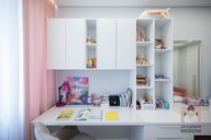 В рабочем уголке школьницы установлен большой удобный стол с широкой столешницей. Здесь достаточно места и для учебы, и для творчества. Над столом оборудованы полки, закрытые распашными фасадами, что позволяет содержать рабочее место в визуальном порядке.