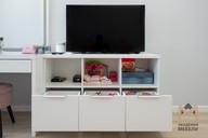 Противоположную стену украшает тумба под телевизор с тремя открытыми полками и тремя глубокими выдвижными ящиками. Здесь разместились полезные мелочи, учебные материалы, наборы для творчества и мультимедийные устройства.