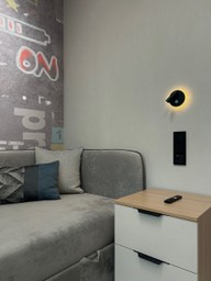 Мы изготовили две тумбы (по одной для каждого брата), полностью повторяющие стилистику рабочего уголка. Корпус с древесной текстурой мягко контрастирует со светло-серыми фасадами двух выдвижных ящиков. Матовые черные ручки-профили идеально перекликаются с фурнитурой на стене — черными выключателями, розетками и современными бра.