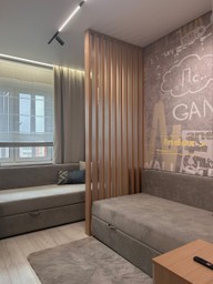 Жить в одной комнате с братом веселее, но личные границы никто не отменял. Чтобы визуально и психологически разделить спальные места парней, мы изготовили и установили легкую реечную перегородку.