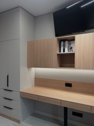 Навесной модуль. Над столом установили подвесную конструкцию, где открытые полки чередуются с закрытыми фасадами. Это ломает монотонность стены и дает место для книг, коллекций или гаджетов.