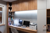Текстуры: Мы использовали декор «Дуб Канзас Коричневый» для рабочей зоны и стеллажей. Он добавляет уют, визуально связывая мебель с интерьером. В качестве контраста выступает «Светло-серый» фасад шкафа — он «успокаивает» интерьер и не перегружает пространство, делая громоздкую систему хранения легкой для восприятия.