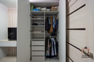 Завершает композицию второй платяной шкаф. Внешне он поддерживает геометрию первого, но внутри другое наполнение: 2 штанги для одежды на плечиках, выдвижные ящики для белья и дополнительные полки.