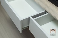Далее мебельная композиция прерывается, образуя нишу для зоны отдыха. Здесь мы установили ТВ-консоль с двумя глубокими выдвижными ящиками (столешница также в древесном декоре белого ясеня).