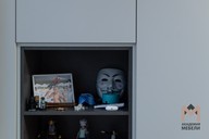 Базовый корпус выполнен в оттенке «Светло-серый» и дополнен брутальным «Бетоном Чикаго темно-серый» от бренда Egger. Фасады в мягком матовом декоре Кедр «Туман» добавляют конструкции воздуха и визуально разгружают пространство. А чтобы интерьер не казался слишком холодным, мы ввели теплую древесную текстуру — «Ясень белый exclusive».