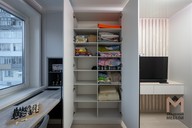 Плавный переход от окна обеспечивают две открытые полки, за которыми выстраивается первый платяной шкаф. Его наполнение спроектировано строго под запросы заказчика — внутри расположены только полки для одежды.