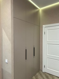 У входа — высокий встроенный шкаф до потолка с гладкими серыми фасадами и торцевыми чёрными ручками. Верхний антресольный ряд открывается от нажатия, что избавляет от лишних деталей и поддерживает ровную плоскость фасадов. Матовый, «бархатный» на ощупь серый цвет смотрится спокойно и дорого, хорошо работает в спальнях и нейтральных интерьерах.