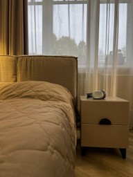 Рядом с кроватью стоит компактная прикроватная тумбочка на чёрных ножках. Верхний выдвижной ящик оформлен рифлёным фасадом, нижний — гладкий, за счёт этого маленький предмет смотрится как дизайнерский акцент. Полукруглая чёрная ручка подчёркивает геометрию фасада и перекликается с другими тёмными деталями в комнате.