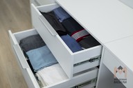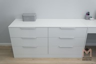 Рабочая зона продумана до мелочей: длинная столешница образует вместе с вместительной тумбой цельную и аккуратную линию у стены. Шесть глубоких выдвижных ящиков позволяют удобно разложить все нужные вещи — от документов до техники.