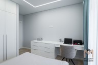 Столешница достаточно просторная, чтобы разместить и ноутбук, и оргтехнику, и оставить рабочее пространство свободным. Матовое покрытие в цвет мебели не отвлекает, а встроенные розетки на стене делают зарядку гаджетов максимально удобной.
