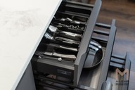 Нижний ряд состоит из вместительных выдвижных ящиков. Это удобно для повседневной эксплуатации, а еще визуально поддерживает минимализм композиции. В единственном модуле под мойкой - распашной фасад. Внутри него установили защитный пластиковый поддон для долгой эксплуатации и сохранения первоначального вида.