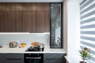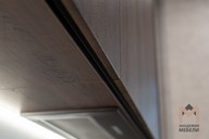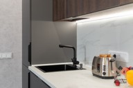 Важной частью кухни выступает столешница и стеновая панель Slotex в декоре «Мрамор Бернини». Этот материал не только визуально усиливает общий тон интерьера, но и отличается практичностью — он влагостоек, прочен, имеет антибактериальную поверхность и защиту от царапин. Фурнитура Hettich гарантирует плавность хода, надёжность эксплуатации. А еще дает возможность индивидуальных настроек.