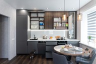 Светодиодная подсветка подчёркивает архитектуру кухни, делая приготовление любимых блюд комфортным даже в вечерние часы.
