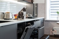 Вся техника скрыта за фасадами — посудомоечная машина, вытяжка, холодильник, что обеспечивает функциональность без нарушения эстетики. В местах повышенной нагрузки (под духовым шкафом и посудомоечной машиной) специальные защитные накладки.