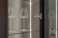 Мягким акцентом выступает узкая колонка у окна. Снаружи - фасад из стекла «Графит глянец» в черном алюминиевом профиле. Внутри – стеклянные полки и декоративная подсветка. Идеальное место для любимой посуды, бокалов или декора.